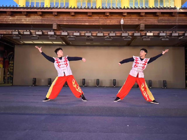 2月7日,团队成员赵贺博与徐子恒在山东省济南市槐荫区裴家庄的文艺晚会上,身着彩衣,以“伞、鼓、棒、花、丑”等元素,演绎了古代战阵的磅礴气势。队形变换如“牛鼻钳”“八条街”,每一步都展现了黄河儿女的豪情。商河鼓子秧歌作为“山东三大秧歌”之首,山东地区的传统民间舞蹈,历经千年传承,现已被列入国家级非物质文化遗产名录。其节奏明快,气势磅礴,展现了人民豪迈奔放的性格和乐观向上的精神风貌,赢得了现场观众的热烈掌声。