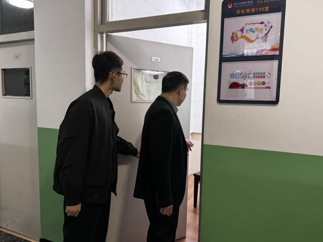 检查过程中,工作小组重点核查琴房用电安全、消防设施配备及应急通道畅通情况,对“人走未断电”等安全隐患进行详细记录并现场指导整改。期间,蘧广震向在场学生讲解琴房安全使用规范,强调严禁使用违规电器、乱接电线等行为,同时加强消防安全宣传教育,普及灭火器操作、应急疏散等知识,要求全体同学切实提高安全意识,共同维护安全稳定的学习环境。