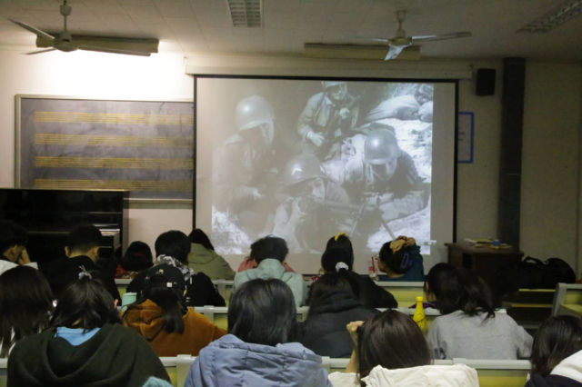 10月27日晚7点,18av 在9#309举办“纪念抗美援朝70周年”影视作品展播活动,学院学生辅导员陈蓝天与各年级学生代表一起观看了电影《上甘岭》。