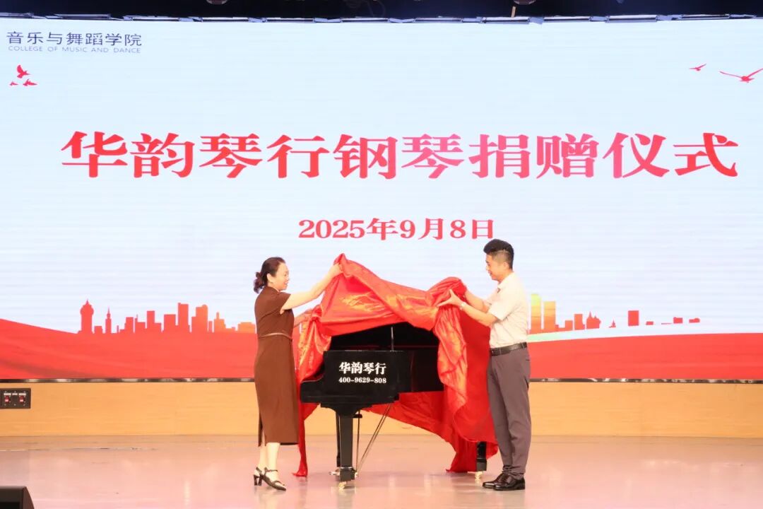 在热烈的掌声余韵中,钢琴捐赠仪式正式开启。学院党委书记路灿云首先对长期支持学院艺术教育事业发展的华韵琴行表示衷心感谢,他谈到,这架钢琴不仅是一件乐器,更是社会各界对学院艺术教育支持的有力见证,将为学院的教学和艺术实践提供有力保障,助力学生们在音乐的海洋中更好地遨游。华韵琴行总经理邓峰利上台发言,表达对音乐与舞蹈教育事业的支持,并希望通过此次捐赠,为艺术人才的成长贡献力量。随后,在全场师生的共同见证下,尹蕾与邓峰利共同为新钢琴完成揭彩仪式,并为其颁发捐赠证书,以感谢其对学院艺术教育事业发展的大力支持。