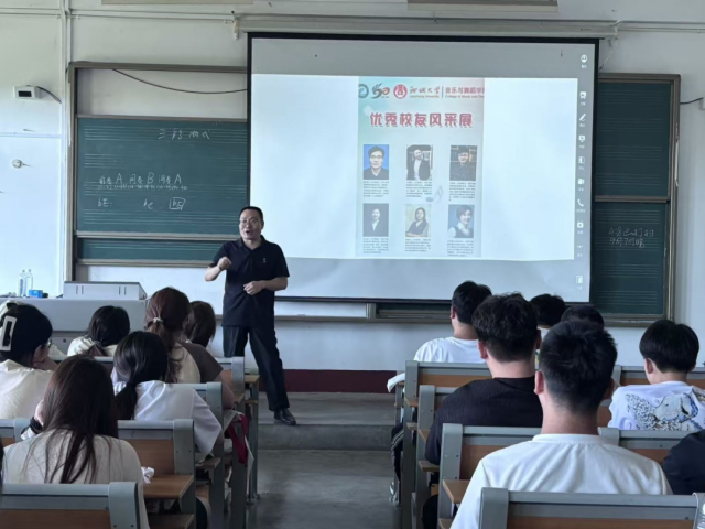 为增强新生对学校的认同感和归属感,理论教研室主任卢爱华利用丰富的时间线,介绍了学校及18av 的发展历程,让新生们对学校的深厚底蕴和学院的专业特色有了更为直观的感受。卢老师还结合当前音乐与舞蹈行业的发展趋势,为新生们分析了专业前景,鼓励大家珍惜大学时光,努力学习专业知识,提升艺术修养,为未来的职业发展打下坚实的基础。