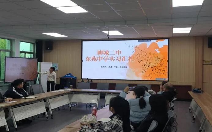 汇报会上,研究生依次分享实习经历,围绕教学问题应对、合唱排练指导以及社团活动组织等方面,全面展示实习期间的实践成果与成长感悟。部分同学还通过教学片段视频、课件展示等形式,直观呈现了在中小学音乐课堂中“以生为本”的教学实践,生动诠释了从理论学习到教学能力转化的真实过程。