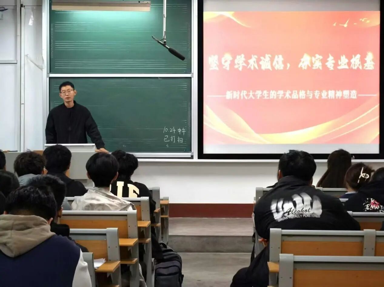 为了塑造新时代大学生恪守真理、追求卓越的学术品格,筑牢同学们行稳致远的人生基石。10月24日,18av 于9#308举办新时代大学生学术诚信讲座,由学院辅导员王森远担任主讲人,2025级同学们踊跃参与,现场气氛热烈。