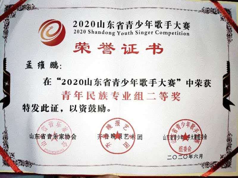 孟维鹏在2020山东省青少年歌手大赛荣获青年民族专业组二等奖