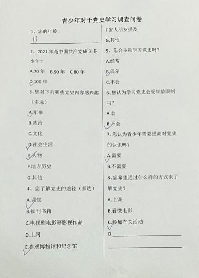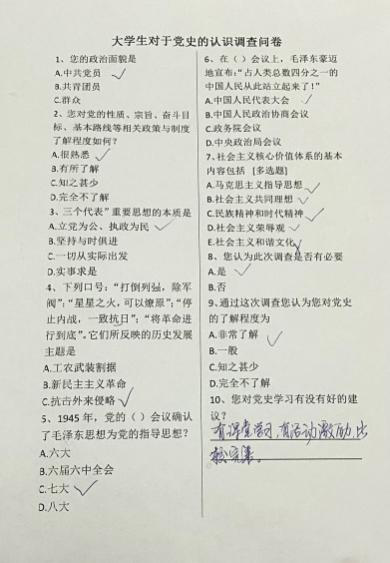 为了更好的推崇学党史要把党的历史学习好、总结好、传承好、发扬好,从百年历程中传承红色基因,调研队成员张贺向周围街坊邻居分发了纸质版调查问卷进行调查,征集了青少年、大学生和社会人群三类调查对象。目的是为了了解不同年龄段不同身份的人对于党史的了解情况。经过调查,一、青少年对于基本的党史是有一定了解并有一定的兴趣,对于青少年来说其主要任务是提起对党的有关兴趣;二、可以看出大学生对于党史是有所学习的,一些关于党历史的问题都基本了解,对于大学生来说学习党史就是基本任务,大学生要做的不仅是学好党史还要将其发扬光大;三、在社会人群中年龄稍长的都是跟党一起经历过来的,对于党他们可谓是非常了解,他们看着国家被党组织着、改变着,对于党他们有着深刻的领悟。