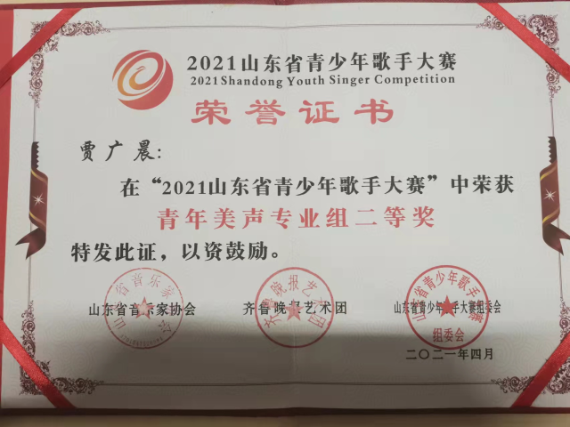 2019级2班贾广晨在2021年4月“2021山东省青少年歌手大赛”中荣获青年美声专业组二等奖