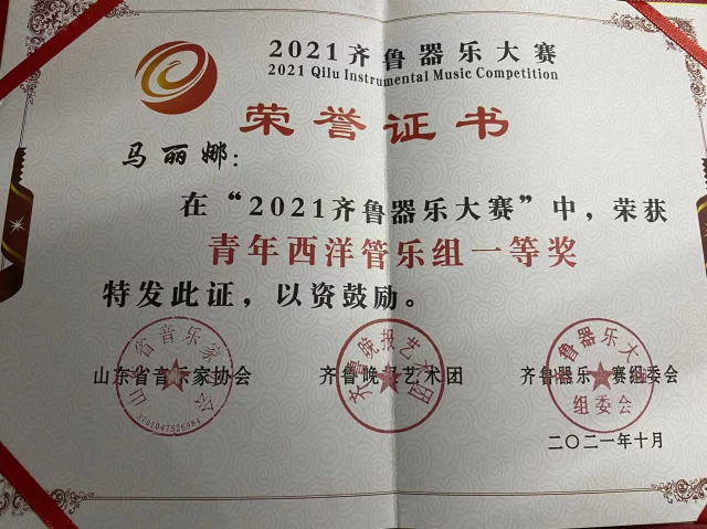 2018级4班马丽娜在“2021齐鲁器乐大赛”中,荣获 青年西洋管乐组一等奖