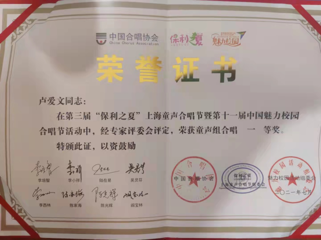 2018级2班卢爱文在2021年七月获得第三届“保利之夏”上海童声合唱节暨第十一届中国魅力校园合唱节获一等奖