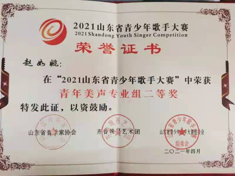 2018级5班赵如姚在2021年4月在“2021山东省青少年歌手大赛”中荣获 青年美声专业组二等奖