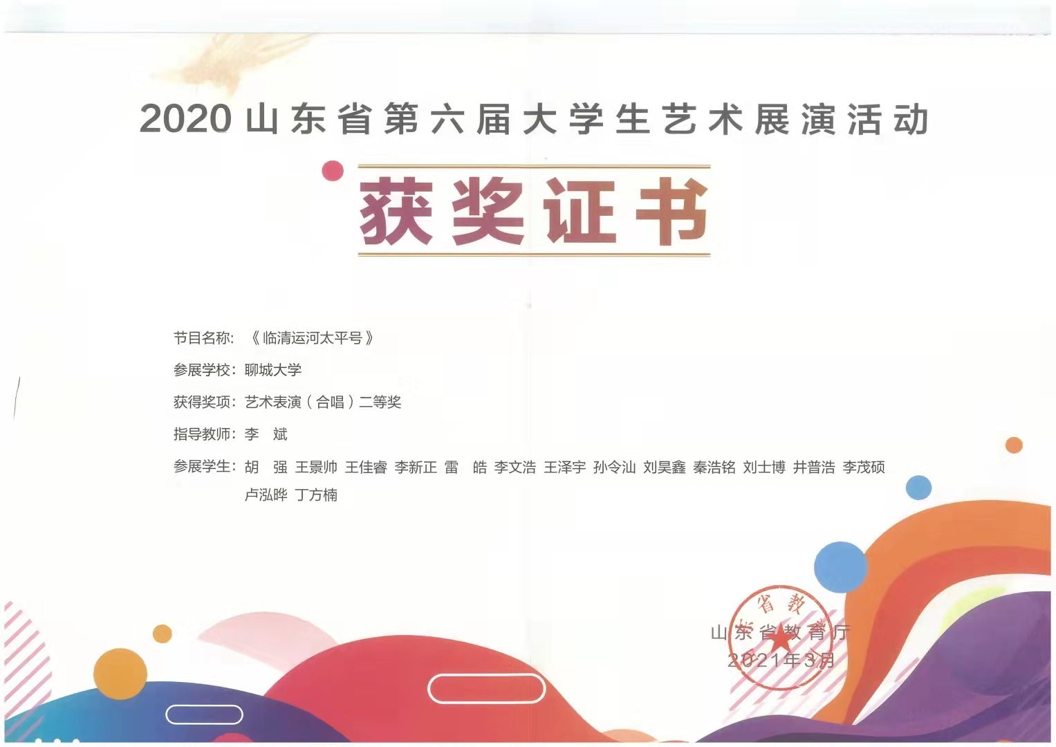 2020级2班丁方楠在2021年3月山东省第六届大学生艺术展演中获艺术表演(合唱)三等奖