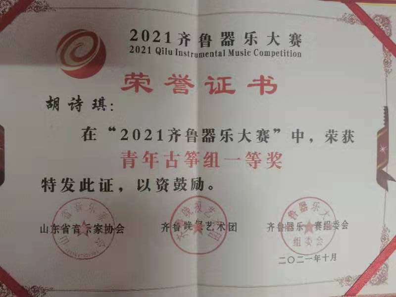 2019级6班胡诗琪在2020年10月“2021齐鲁器乐大赛”中,荣获青年古筝组一等奖