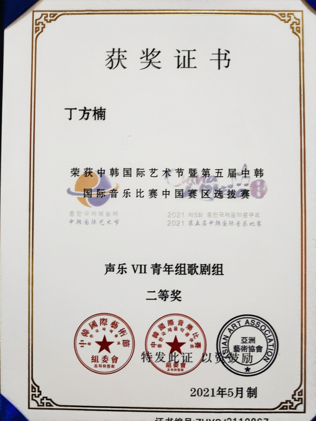 2020级2班丁方楠在2021年5月荣获中韩国际艺术节暨第五届中韩 国际音乐比赛中国赛区选拔赛获声乐VII青年组歌剧组二等奖