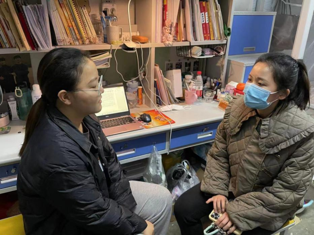 岳圆老师前往学生宿舍,与家庭经济困难学生进行了亲切友好的交流。在交谈中,老师们详细了解了学生家庭情况及受助需求,介绍了国家及学院相关资助政策,并针对学生在学习和生活中出现的问题进行了详细的解答,鼓励引导学生自强自立、努力奋斗。