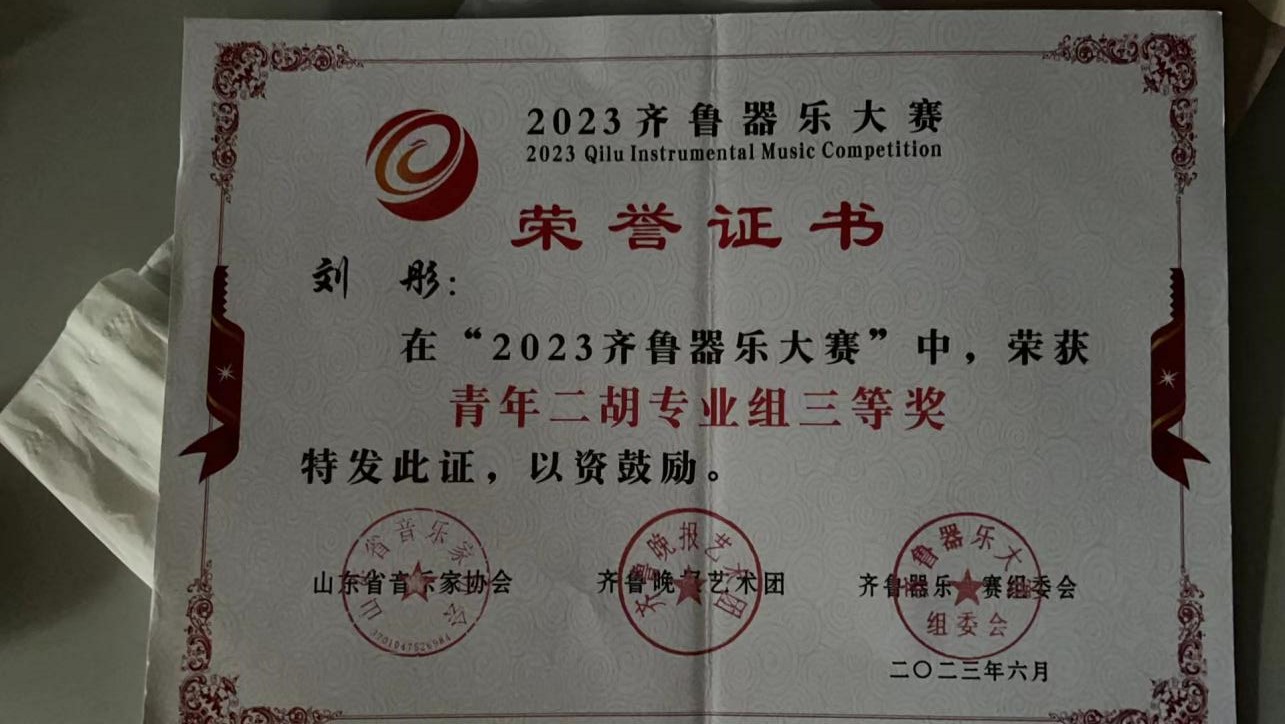 刘彤荣获“2023齐鲁器乐大赛”三等奖
