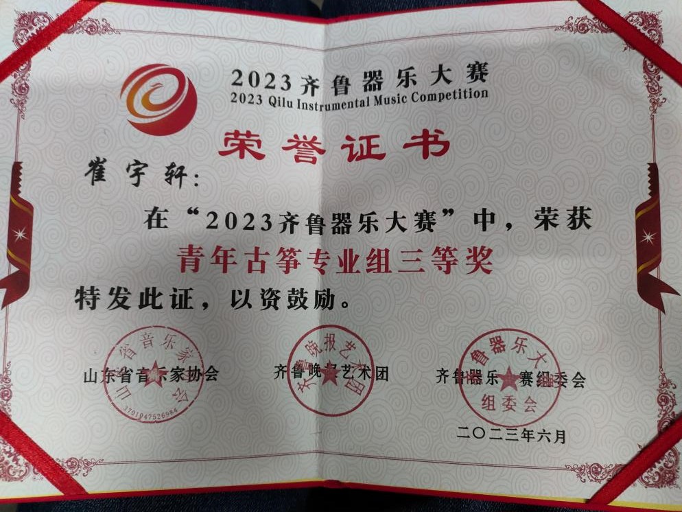 崔宇轩荣获“2023齐鲁器乐大赛”三等奖