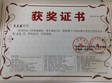 豆玉茹荣获“第十八届全国大学生文学作品大赛”三等奖