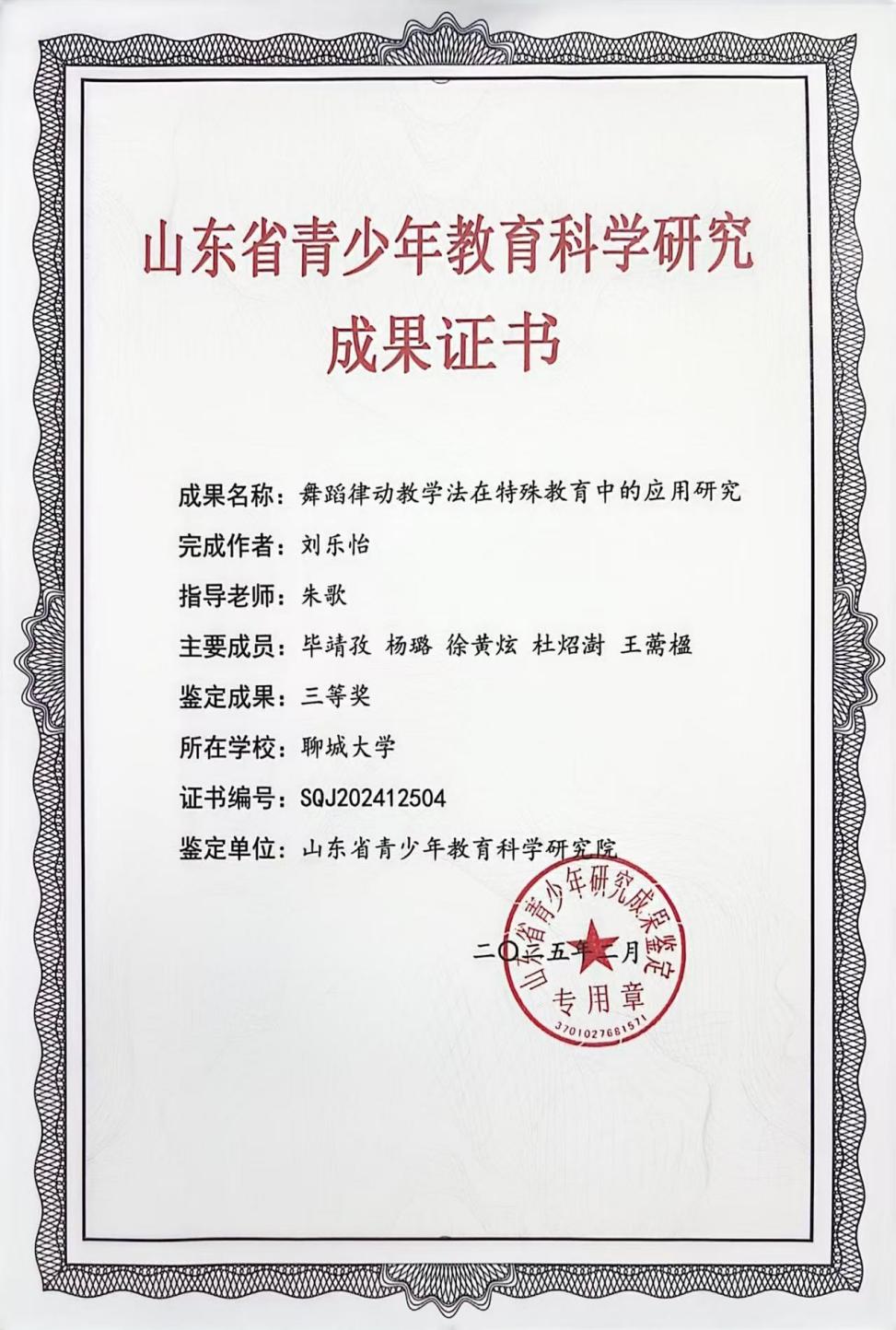 18av 家庭经济困难学生刘乐怡的成果《舞蹈律动教学法在特殊教育中的应用研究》在山东省青少年教育科学研究成果鉴定中获得三等奖。