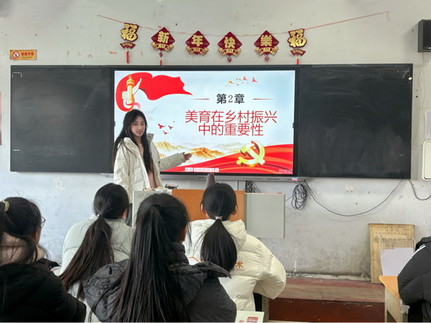 2月6日,团队成员李春婷回到自己的母校,开展了一场以“美育领航,乡村换新”为主题的宣讲活动。过程中,李春婷以孔繁森精神为切入点,借助生动的故事与精美的图片,深入浅出地向学生们阐述,学生们深刻认识到美育不仅是艺术学习,更是提升乡村文化内涵、推动产业发展的强大动力。现场互动热烈,学生们对美育助力乡村振兴充满期待。