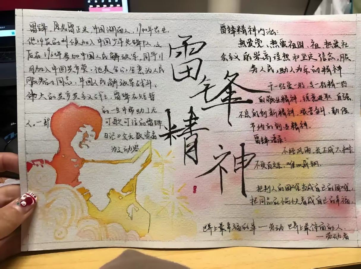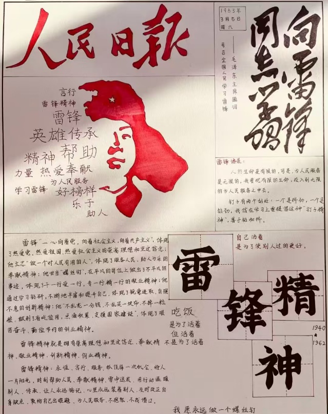 活动中,同学们充分发挥自己的动手能力和创新思维能力,创作出一幅幅主题鲜明、内容丰富的手抄报。有的罗列雷锋日记金句,展现其纯粹精神;有的描绘雷锋精神在生活里的传承,寓意它融入时代,化作平凡人的坚守担当。这些手抄报不仅生动再现了雷锋的感人事迹,更深刻体现出同学们对雷锋精神的深刻理解,以及传承和弘扬雷锋精神的坚定决心。