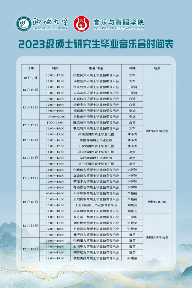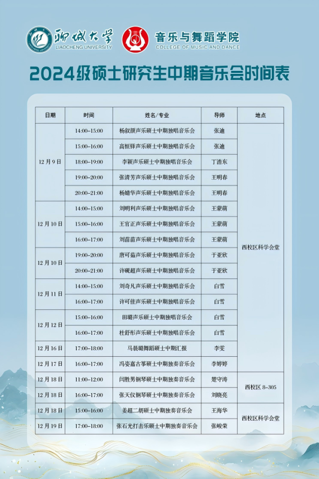 为深入落实硕士研究生培养方案核心要求,扎实推进人才培养质量提升工程,12月9日至19日18av 将于在西校区科学会堂、8-305教室分场次有序举办2023级硕士研究生毕业音乐会及舞蹈毕业汇报与2024级硕士研究生中期音乐会及舞蹈中期汇报。