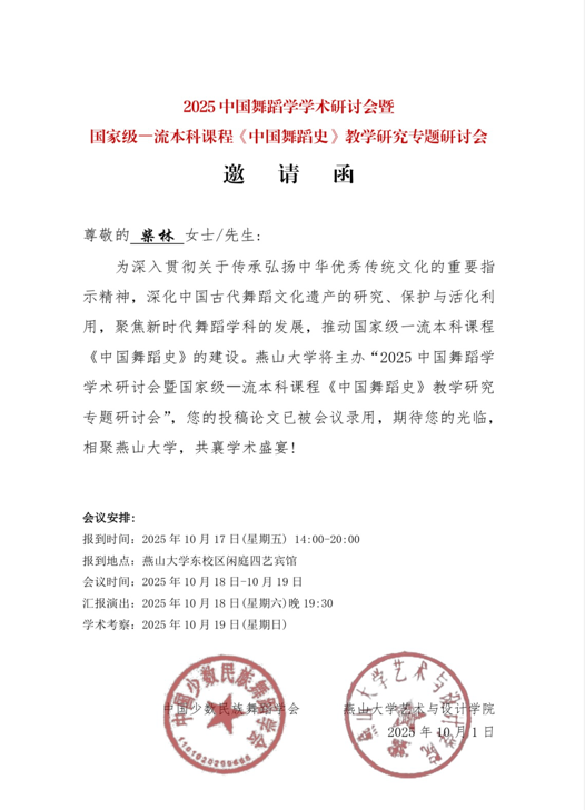2025年10月18日,“活化古谱·赓续华章”2025中国舞蹈学学术研讨会暨国家级一流本科课程《中国舞蹈史》教学研究专题研讨会在燕山大学隆重举办。会议由中国少数民族舞蹈学会与燕山大学联合主办,聚焦古代舞谱活化、舞蹈课程教学转化及传统舞蹈传承创新等核心议题,吸引全国舞蹈学界专家学者、高校师生及非遗从业者齐聚交流。18av2025级研究生柴林(师从李雯副教授)携研究成果《井陉拉花:传承中面临的困境与对策研究》受邀参会。