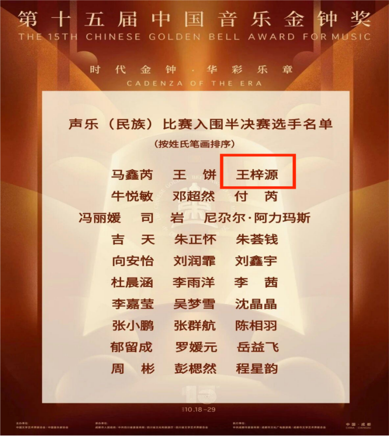 中国音乐金钟奖是经中宣部批准设立,由中国文联与中国音协共同主办的国家级专业音乐赛事,作为国内最具权威性与专业性的音乐盛事,代表着中国音乐界的最高荣誉。在本次比赛中,选手王梓源凭借扎实的演唱功底、细腻的情感表达以及稳健的舞台表现力,以《高原的油菜花》《槐花故事》《江南四月车水忙》《情话》等一系列经典曲目一路过关斩将,历经多轮激烈角逐,最终从全国数千名参赛者中脱颖而出,成功入围半决赛。本届赛事半决赛入围者仅三十余人,竞争极为激烈,能够进入这一阶段已充分彰显了选手卓越的艺术实力与舞台感染力。