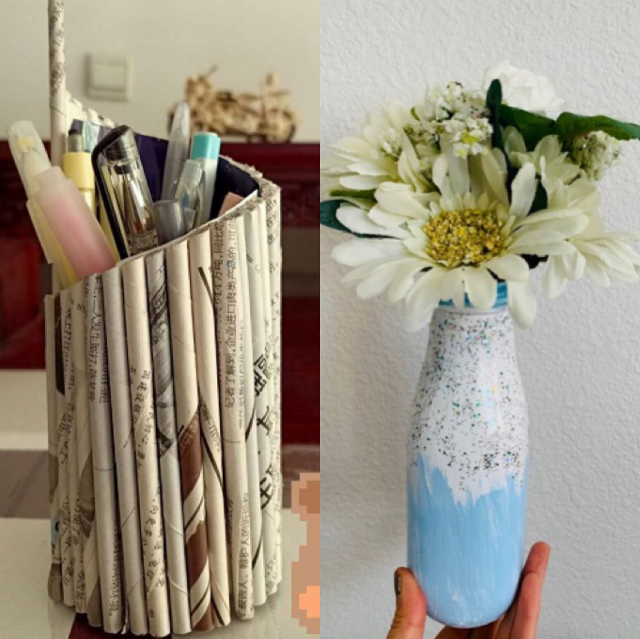 此次活动要求同学们发挥想象力用废弃物制作成利用价值大的物品,可自行创新,并通过拍照的方式将制作完成后的作品上传到群作业中。通过照片,展现了同学们的创造能力,从自己的生活出发,寻找那一个个看似不起眼的物品,把它们变得有用,如:蚊香盒变成了小花盆、鸡蛋盒变成了手机支架;纸提袋变成了分类垃圾箱;废纸变垃圾盒;旧牙刷变身成为刷杯子底的方便刷;纸箱变收纳箱、奶箱的把手变成了口罩。同学们在巧妙细致的改造中实现了资源的有效利用。