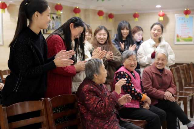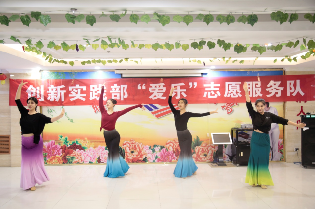 志愿者们为老人们带来了一场多彩纷呈的才艺表演。竹笛演奏《家乡的歌》讴歌了家乡欣欣向荣的动人景象和人们建设美好未来的高度热情;舞蹈《傣族组合》“远上上海少博赛,竹林深处是傣家”,优雅的舞姿展现民族风情;诗歌朗诵《晚照依然红》为老人送去了祝福;琵琶演奏《阳春白雪》“余音绕梁,不绝如缕”的韵味萦绕整个活动现场;《伊犁河的月夜》等歌曲以其动听的旋律带动现场气氛。活动环节“猜歌名”,志愿者为老人们设置了耳熟能详的歌曲,老人们纷纷参与,与志愿者同台演唱,现场充满欢声笑语。一个多小时的才艺展示虽然不够华丽但却充满温情。演出结束后,志愿者围坐在老人身边话家常、捶背按摩,给予老人满满的祝福与情感陪伴。许多老人说“今天我非常开心,子女在外工作,不能常来看我,这些学生的到来,让我很开心也很感动。”