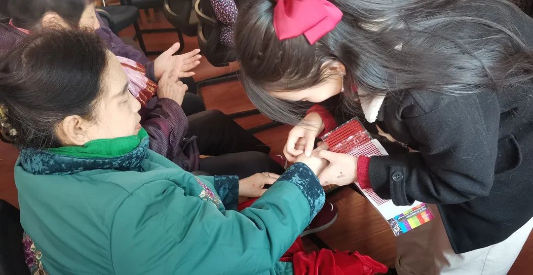 首先,志愿者播放了《预防阿尔茨海默症》的视频,视频中针对记忆衰退、心情多变等情况做出深入分析,对阿尔茨海默症病理表现做出详细解释,并在视频结束后对阿尔茨海默症进行了补充说明,他们告诉老人,阿尔茨海默症虽然危害性很大,但通过预防和治疗是可以减缓的,所以不用过度担心。接着志愿者带领老人们复习了《手指操》的内容,强调《手指操》中预防老年痴呆的穴位,给老人们“一对一”找到穴位贴好标签,带领老人一遍遍复习。最后,老人们对这些穴位都很熟悉,并表示回家后一定坚持练习,远离阿尔茨海默症。