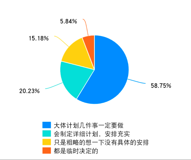 据调查显示:大多数同学还是能够意识到寒假不仅是一个休闲娱乐的时期,更是一个提升自己,锻炼能力的有效时期。例在“对于寒假,你会有安排计划”问题中百分之七八十的同学都回答“有”,这意味着只有少部分同学针对一个多月的假期没有计划安排,空虚地度过一天天假期。而在“对已规划好的假期的实行情况如何”这一问题来看,只有12.84%的同学能够完全按照自己制定的计划来做,这就和每个同学的自律情况相关了。