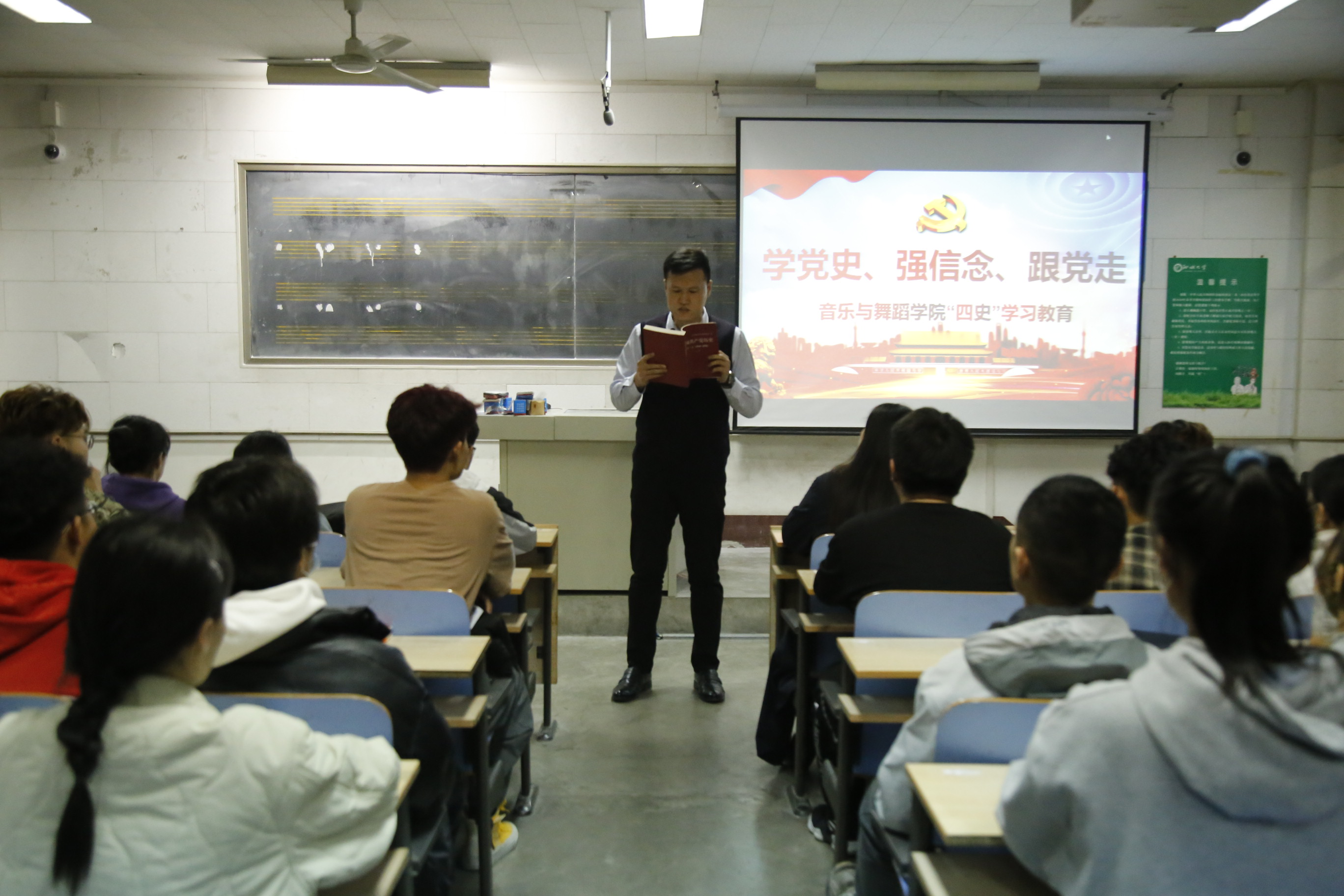 梁建新首先讲解了党史学习的重要意义,他说,学史明理、学史增信、学史崇德、学史力行,作为社会主义事业的合格建设者和可靠接班人,我们应该认真学习党史、新中国史、改革开放史、社会主义发展史。学党史、悟思想、办实事、开新局,在学习中树立伟大目标,在学习中坚定理想信念,在学习中将自己的梦想融入到国家的发展之中。接着,他就大学生如何学好党史提出了自己的见解,一是要从经典原著中去学习,多读书,读好书,从书籍中去汲取力量。二是从伟大实践中去学习,多读新闻,多关注身边的故事,将党史学习融入生活、融入实践。三是从思考中去学习,平时要多思考,多反思,只有深入的思考,才能更好的领悟,更好的实践。最后,梁建新强调要将党史学习同学院专业相结合,多创作、演绎、传播优秀文化作品,让红色传统、红色基因、红色血脉在学院中深深扎根。