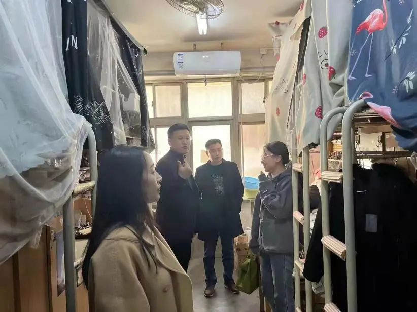 蘧广震一行走进研究生宿舍与学生亲切交谈,详细了解了学生平时学习生活情况,重点检查了使用违规电器、超载用电、私拉电线、消防通道占用、存放易燃易爆物品等安全隐患问题。蘧广震叮嘱同学们要高度重视宿舍安全问题,牢固树立安全意识,防患于未然;要严格落实学校各项疫情防控要求,做到非必要不外出;要注意宿舍卫生,努力养成健康良好的学习生活习惯,积极营造安全、健康、舒适的宿舍环境。