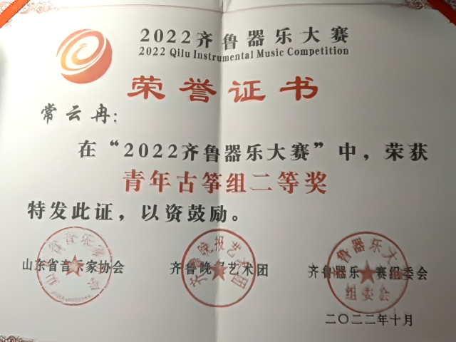 常云冉在”2022齐鲁器乐大赛“中,荣获青年古筝专业组二等奖。