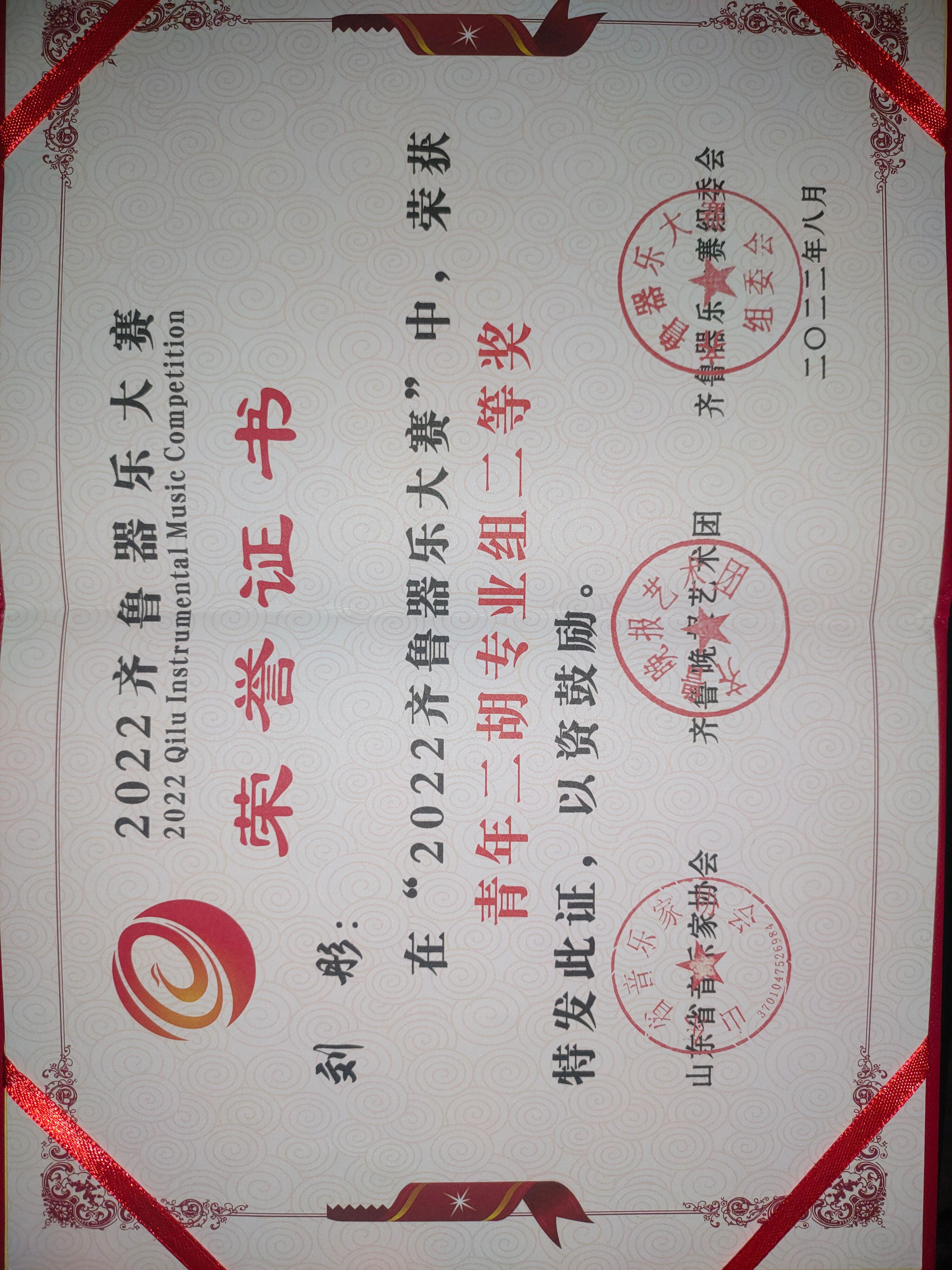 刘彤在2022齐鲁器乐大赛中,荣获青年二胡专业组二等奖。