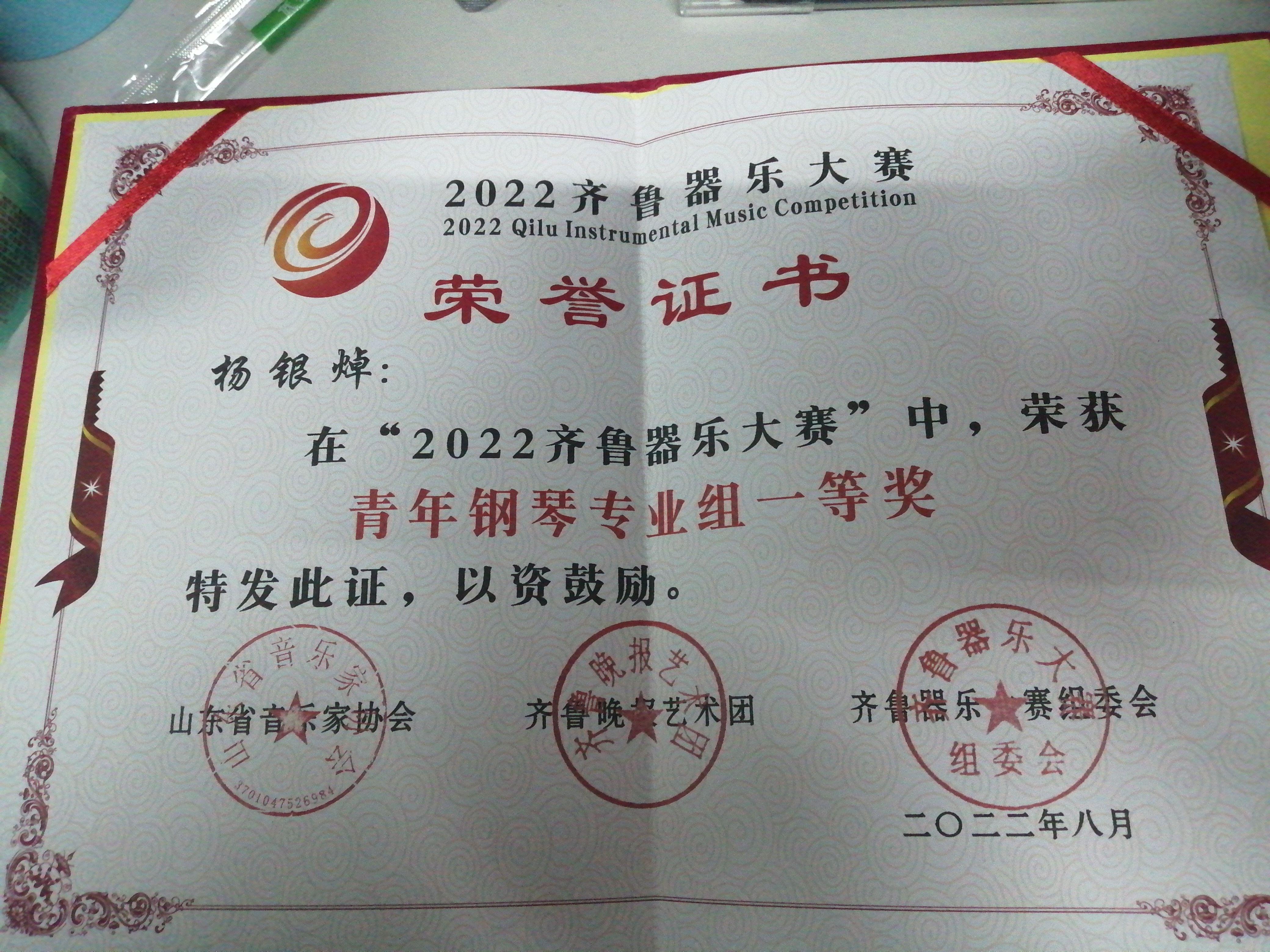 杨银焯在2022齐鲁器乐大赛中,荣获青年钢琴专业组一等奖。