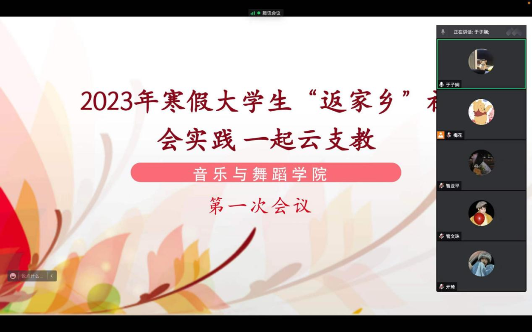 1月7日,18av 以腾讯会议为交流平台,组织召开“一起云支教·奋进新征程”志愿者培训暨动员大会。本次会议由学生会主席王雨和秘书处成员于子娴为志愿者们展开培训,向志愿者明确讲解了支教工作的具体安排内容。