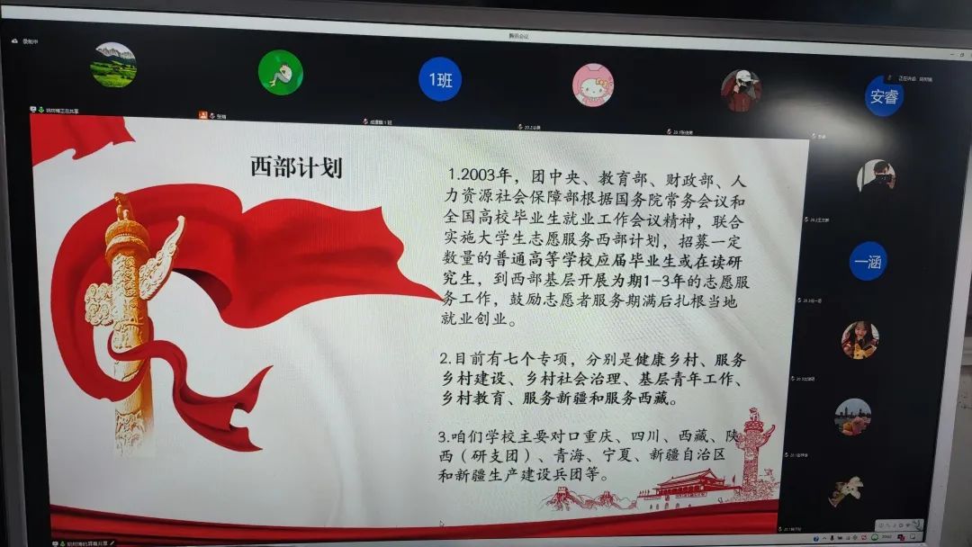 5月12日,2021届西部计划志愿者姚书博与学弟学妹们相聚云端,进行线上宣讲。他重点就自己的亲身经历展开宣讲,提到了自己所在服务地的工作环境、工作情况、补贴待遇、服务地风土人情、安全、食宿等一系列的问题。他们以自己的实践经历为例,向同学们分享自身的西部计划历程。通过畅谈西部新发展、新面貌以及西部计划的新政策、新优势,分享自身志愿初衷、感人事迹,呼吁青年学子怀着“祖国需要处,皆是我故乡”之情怀,用一年不长的时间,做一件终身难忘的事。