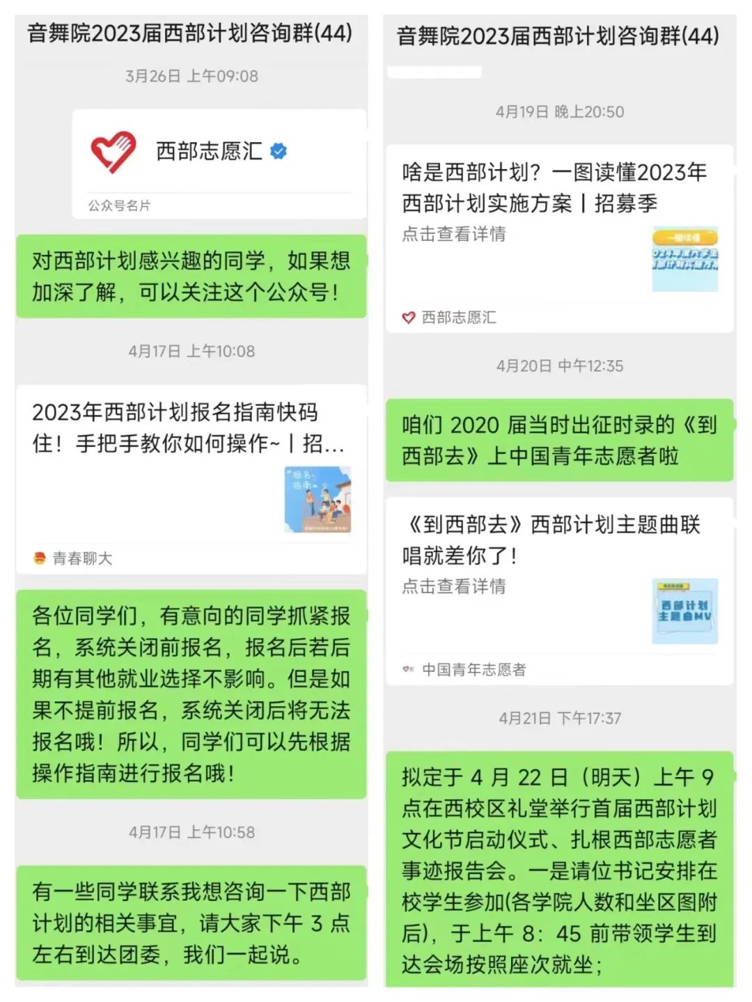 与此同时,学院通过组建2023届西部计划咨询群,定期发布公众号、线下一对一、一对多咨询等方式,让同学们对“西部计划”有了更加深入的了解和认知,让青年人心中多一份家国情怀和时代责任。愿更多有志青年能够奔赴祖国西部,响应国家号召,实现自我价值,将青春的汗水洒在祖国的西部大地上,让青春之花在祖国和人民最需要的地方不断绽放!
