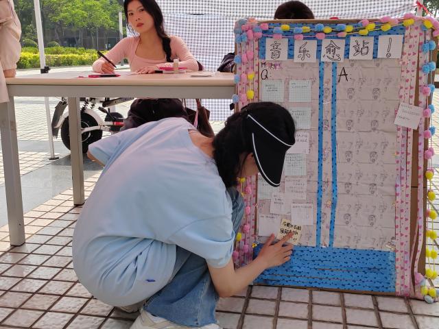 在活动中,同学们进入小房子听着放松的音乐,在便签上写下自己最近的不愉快和烦恼,做好标记,然后贴在小房子中的”音乐愈站“上面,随机挑一张便签阅读,在写下一张鼓励便签贴在一旁的展板上进行循环。让同学们走出困境,正确认识自我,正确对待外界影响,坦然面对负面情绪,认真享受当下的生活。