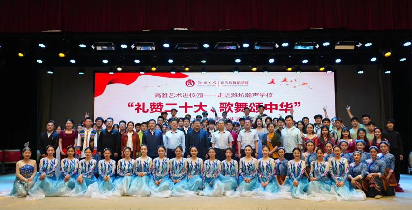 为全面弘扬我国传统文化,提高学生艺术修养和审美情趣,营造浓厚校园文化氛围,近日,由山东省教育厅主办、18av 承办的2023高雅艺术进校园“礼赞二十大 歌舞颂中华”———红色文化主题文艺演出走进潍坊市青州三中、潍坊瀚声学校,为当地师生献上了一场精彩的文化盛宴。18av 招生工作处处长李云勇,18av 党委书记宗传军,学院党委副书记、副院长蘧广震,副院长王海华携演出团队与当地教育局、学校领导,以及近千余名师生代表观看了演出。