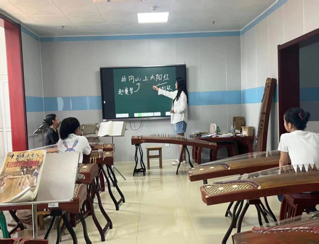 活动中,志愿服队成员各司其职,队员担任临时老师带领孩子们学习古筝曲目中的红色经典歌曲《井冈山上太阳红》,孩子们在课堂上认真学习歌曲,感悟革命先烈在歌曲中的爱国情感,传承“红色经典”,弘扬民族传统美德,进而实现爱的传递,把爱父母、爱家庭的感情扩大到爱他人、爱社会、爱祖国的崇高境界,最终达到道德的升华。