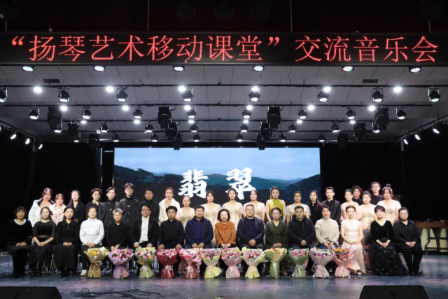 最后,刘月宁教授、尹蕾院长等多位老师共同演奏了《喜讯》,乐曲采用新疆民间音调和舞蹈的节奏,描绘人们听到喜讯时奔走相告的场面,各位老师用高超的技艺和深厚的音乐素养将扬琴的独特魅力展现得淋漓尽致。演出结束后,中国乐器协会扬琴艺术专业委员会会长、中央音乐学院教授刘月宁上台致辞,表示扬琴艺术移动课堂,是我们在新时代、新时期传承与传播中国文化的新使命。扬琴是一件具有中国性、民族性、世界性的乐器,我们要通过移动课堂、乐动出行等多种形式,在中国乃至世界范围内,讲述中国好故事,传递中国好声音,将我们的中国扬琴声音和故事,更好、更深地走出去,走进去!希望同学们能保持对民族音乐的热爱,将扬琴文化不断的传承与发展,相信在大家的努力下山东扬琴音乐艺术能够发展的越来越好。