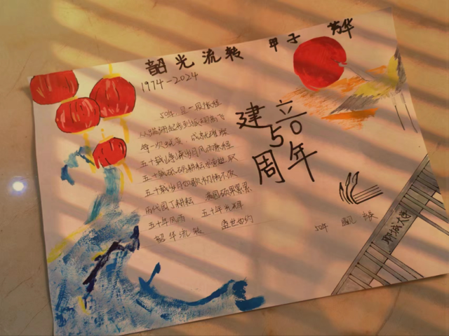 窦资涵用手抄报的方式表达对母校的感恩之情。手抄报上的蓝色浪花与蓝色校徽相呼应,照应着18av 在发展过程中顽强拼搏,努力奋斗、不畏艰苦、勇于奋斗的精神,也表达了18av 阔步向前的信心。红色灯笼和太阳为18av 建校五十周年镀上了一层喜气洋洋的光辉,展现着蓬勃和生机,仙鹤又犹如学业有成的学子,为学校校史添上了华章。右下角的校门和校徽,更体现了学校学子努力拼搏、勇往直前的精神。