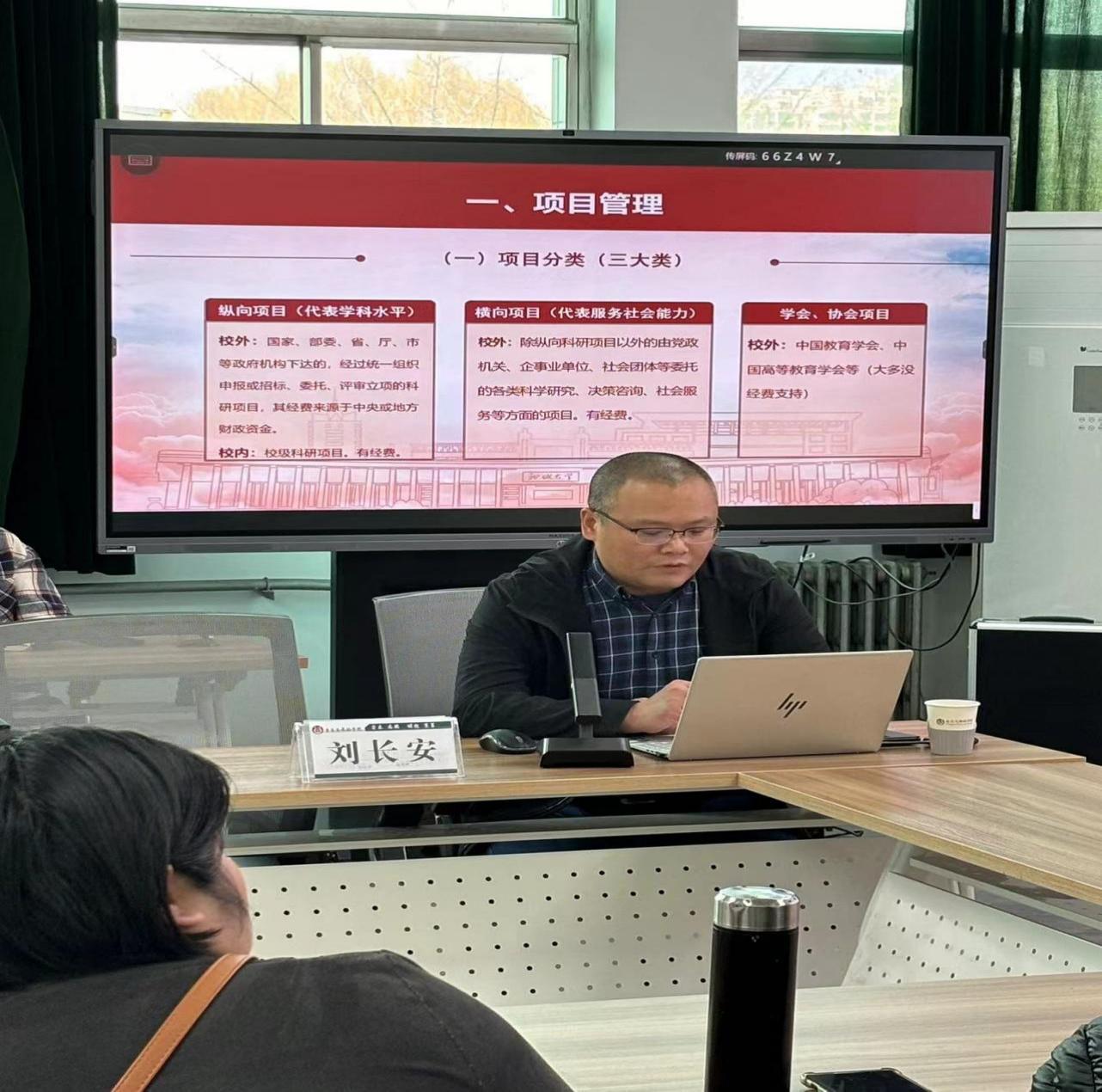 刘长安讲解了哲学社会科学研究项目设立情况、选题以及申报书的撰写,着重讲述了各级项目的分类、申报,分享了项目申报的六大技巧等。他对18av 2023年科学研究工作情况做了详尽的分析,对学院科研存在的问题及发展提出了建设性意见和建议。
