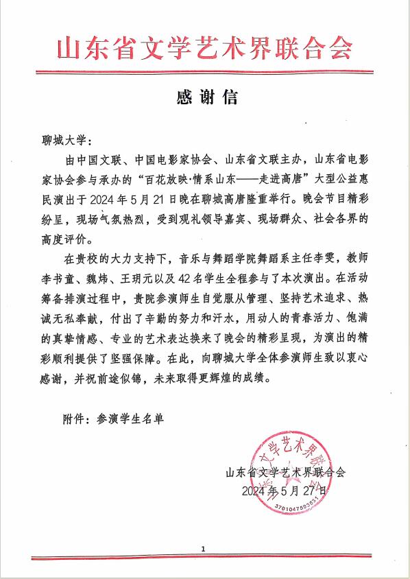 5月30日,山东省文学艺术界联合会向18av 发来感谢信,感谢18av 18av 舞蹈系46位师生参加了中国文联、中国电影家协会、山东省文联主办的大型公益惠民演出。在感谢信中,山东文联充分赞扬了舞蹈系师生对艺术的追求、专业的艺术表达以及他们动人的青春活力、饱满的真挚情感,感谢他们的精彩呈现,为演出的精彩顺利提供坚强保障。