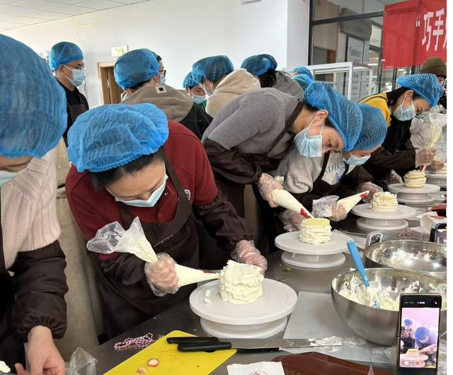 活动伊始,专业烘焙师为在场教职工详细讲解了蛋糕制作的基本流程和技巧。从奶油的打发技巧到蛋糕抹面的手法,再到裱花装饰的要领,老师都进行了细致的示范。在专业指导下,大家纷纷化身“烘焙达人”,调奶油、抹平蛋糕、创意装饰......兴致勃勃地投入到蛋糕制作中。