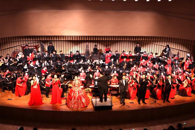 古筝重奏《唱支山歌给党听》通过多声部协作,让红色经典焕发新声;萨克斯重奏《青鸟》则以爵士风格和萨克斯醇厚、灵动,重新诠释了动画金曲;《五月天组曲》将摇滚与交响乐相结合,通过双乐团中二胡与小提琴、唢呐与小号等音色对比,展现了中西乐器的各自独特魅力与组合交响化音乐表现。