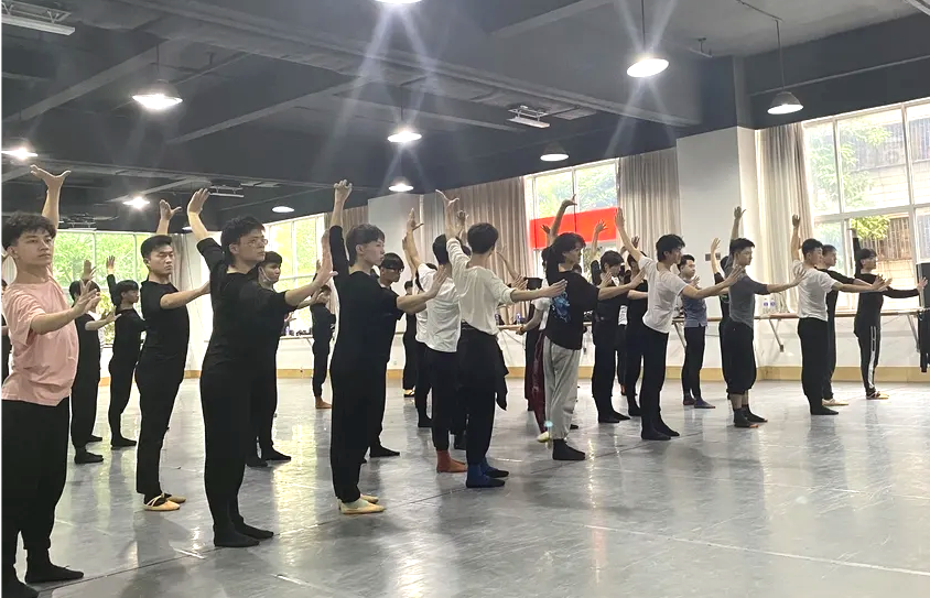 同学们在排练厅不辞辛苦、力求做到精益求精;将一个动作重复练习成百上千次;累到在休息时直接四仰八叉的瘫在地上或者将椅子拼起来当床小憩;在不训练的时候也并不放松而是复习自己的期末考试内容,做到学习演出两不误。